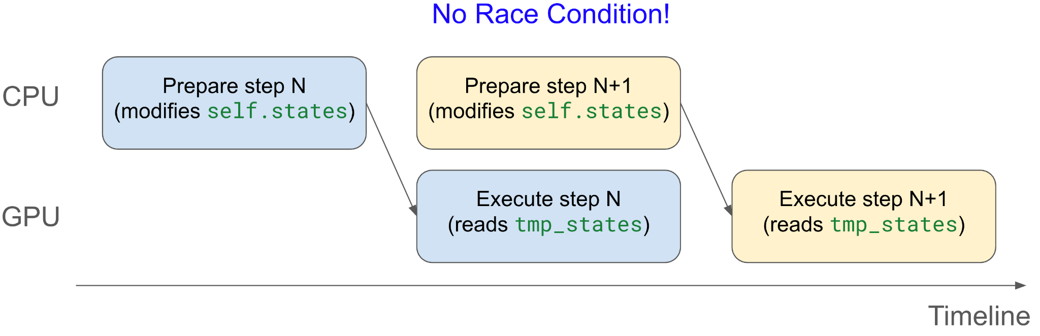 Now CPU writes to self.states while GPU reads from tmp_states, eliminating the race without explicit synchronization.